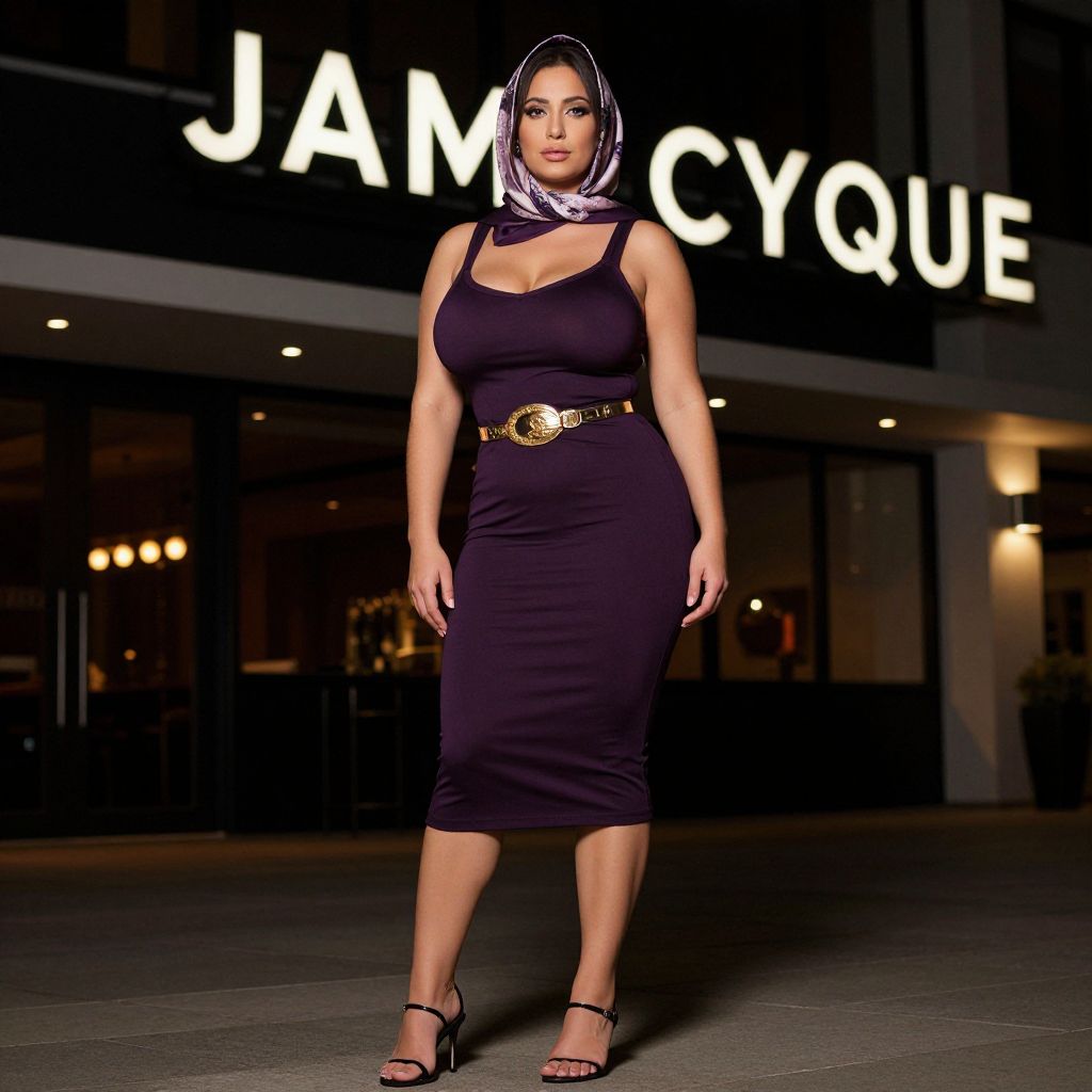 A sexy woman with big tits and a curvy figure is wearing a dark purple dress with a patterned scarf wrapped around her head. She is also adorned with a pair of black sandals and a golden belt that accentuates her waist. She stands confidently in front of a modern building with a bold sign that reads 'JAM CYQUE', the setting glowing softly with ambient city lights. The atmosphere is sultry and atmospheric, highlighting her elegance and allure.