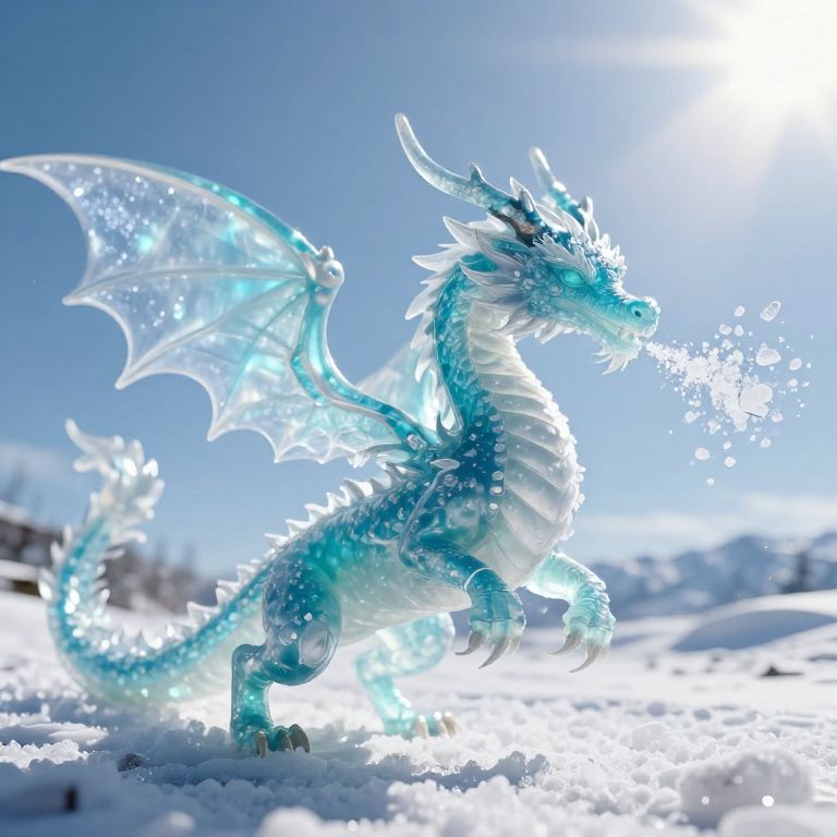 In a sunlit realm where imagination meets reality, a translucent azure dragon exhales shimmering salt crystals, embodying the ephemeral dance between serenity and wonder, as if weaving a tale of otherworldly freedom amidst the mundane.
