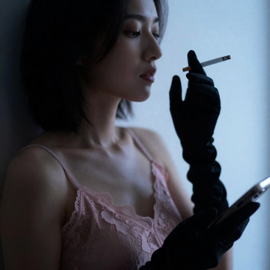 Photograph of a woman in profile, smoking a cigarette, wearing a pink lace camisole, holding a phone in her other hand. Her face is shadowed, with intense focus. Background is dark with blue and white light. Her right hand is raised, holding the cigarette. Black gloves cover her left hand.