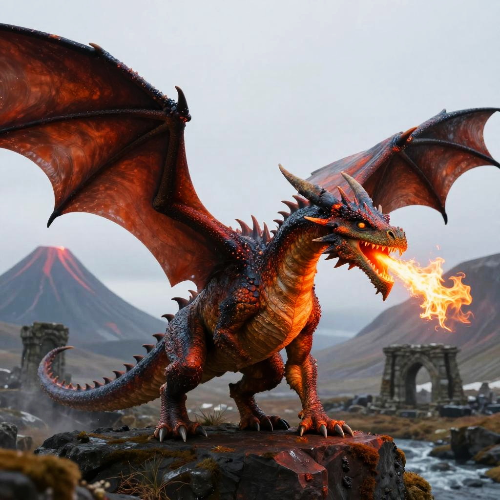 HTTYD dragon generator creating a fantastical dragon with vibrant scales and majestic wings, detailed textures, fiery breath, set against a mystical Nordic landscape with volcanoes and ancient ruins, cinematic lighting, high fantasy style.