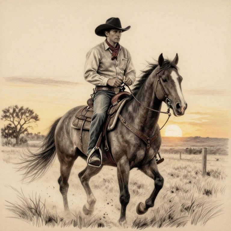 Cowboy pencil art featuring a lone cowboy riding into a sunset on horseback, intricate pencil strokes highlighting the flowing dust and fabric folds, realistic anatomy and expressive facial features with a classic old west atmosphere