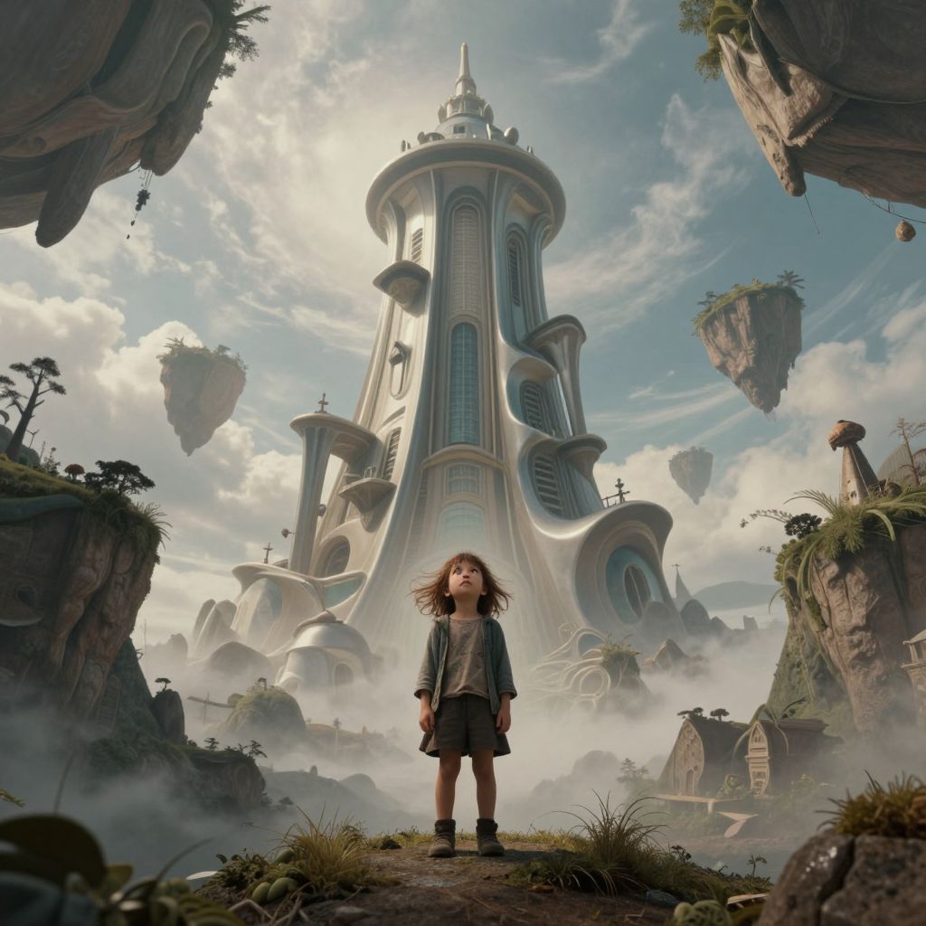 An enigmatic dream landscape is captured in this whimsical scene, where an intricate tower with distorted, fluid architecture dominates the horizon. The sky above is filled with floating islands, their shapes shifting as if viewed through a fisheye lens, emphasizing the surreal nature of the setting. In the foreground, a curious child stands on one of these drifting lands, wide-eyed and flowing-haired, gazing up at the enigmatic tower with a mix of awe and unease, evoking an emotional spectrum that ranges from curiosity to uneasiness in this fantastical landscape.