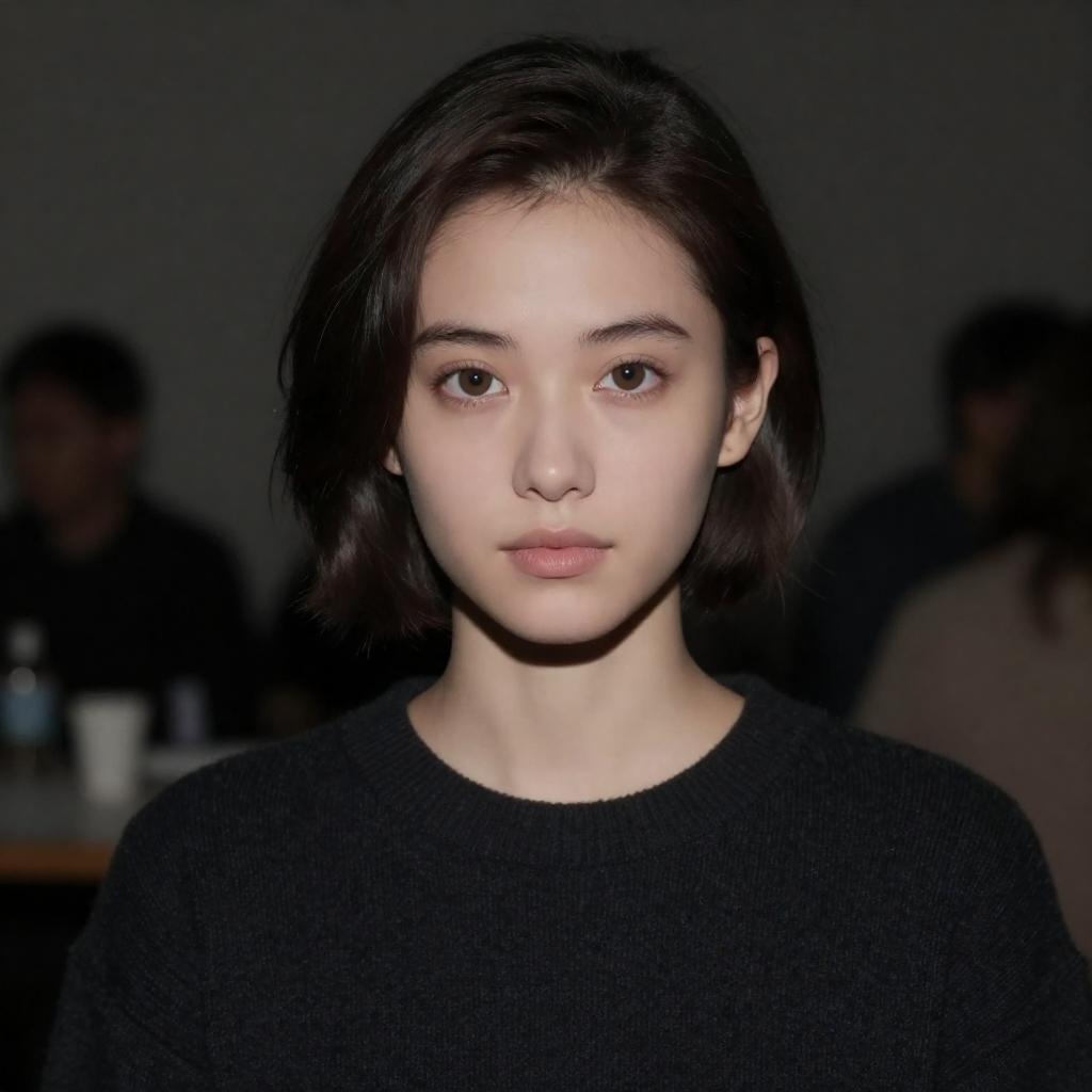 Close-up portrait of a young woman with a messy pixie cut hairstyle featuring bangs. She has fair skin, light eyes, and is wearing a sleeveless black top. The background is neutral gray, emphasizing her facial features and hairstyle in a fashion-style photorealistic image.