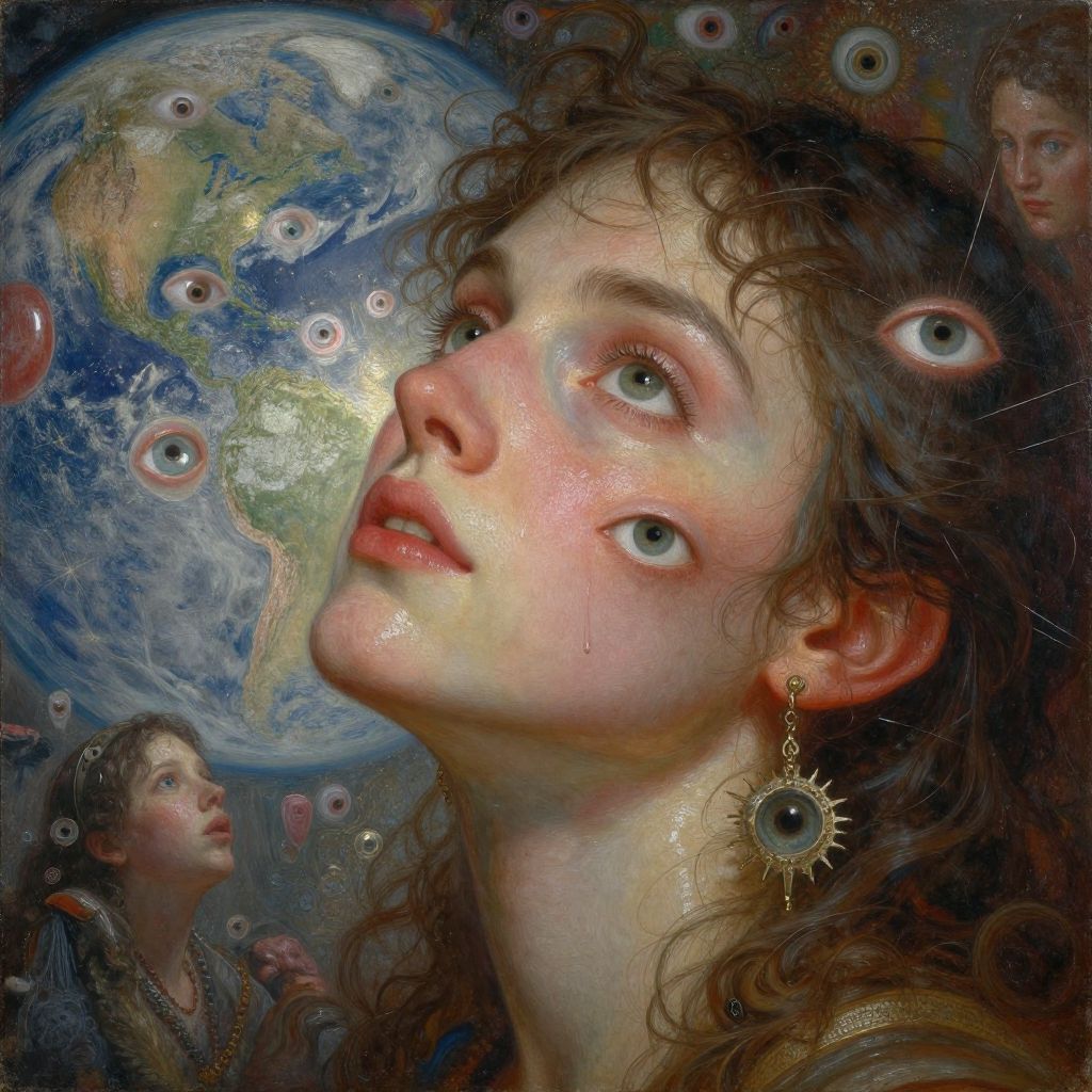 (masterpiece), (best quality), (ultra-detailed), It has been centuries. We have given it the entire earth's GDP and yet still it whispers "more paint". The madness must stop: the painting now extends beyond dimensions, beyond the surface of the earth into some other place, that place whose name is unutterable where the endless one dwells. We are out of money, but it wants more, always more more more: the effort, the meat, the human lives spent in its service. The artist is long gone, that much is sure now, but the damn thing paints itself. There is nothing left but endlessness, illustration, disheveled hair, detailed eyes, perfect composition, moist skin, intricate details, earrings, by wlop, He lifts his head from his head, his eyes on strands of eyes, and in the glitch light handmade and homespun, he sees the visions of pasts lost in enigmatic phantoms and faces of light, full color, extremely detailed, fantastic atmosphere, dynamic dramatic cinematic light, aesthetic, very inspirational, stunning, creative, fine detail, winning grand classic