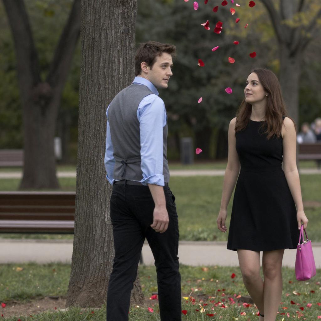 Two young adults sitting on grass in a casual outdoor setting. A blonde woman wearing a red hat, red T-shirt, light blue jeans, and black sneakers is smiling. Next to her is a brown-haired man with a beard, wearing a light blue T-shirt and dark pants, looking serious. Green trees and grass are visible in the background.
