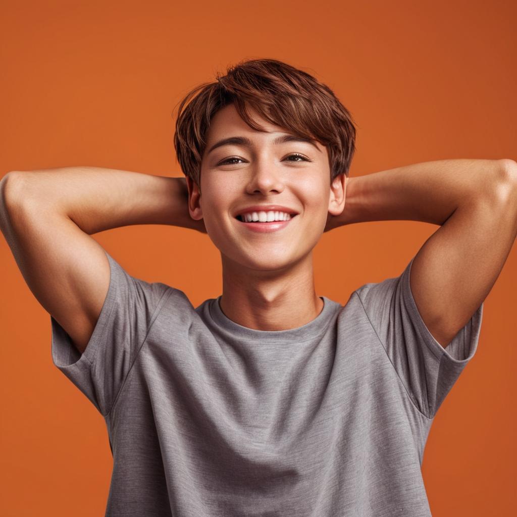 Portrait of a happy young man with brown hair, smiling broadly with his arms behind his head. He is wearing a light grey t-shirt and poses against an orange background.