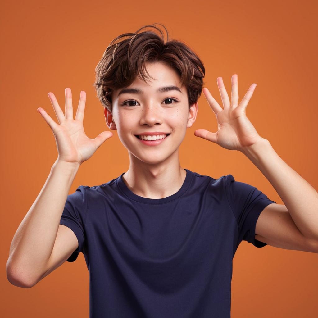 Solo, brown hair, 1boy, brown eyes, male focus, looking at viewer, short hair, simple background, freckles, arms up, portrait, orange background, smile, upper body, thick eyebrows, closed mouth, lips
