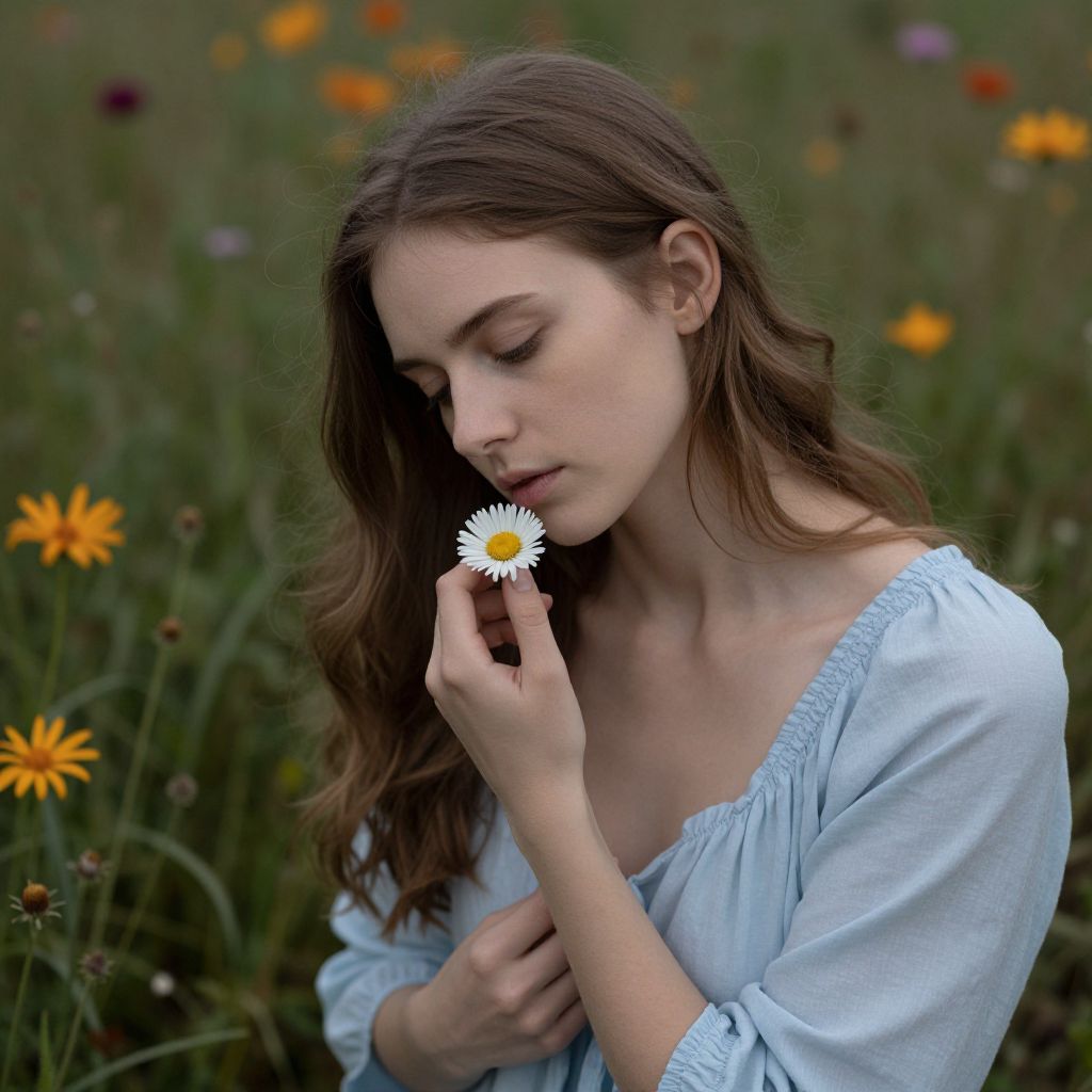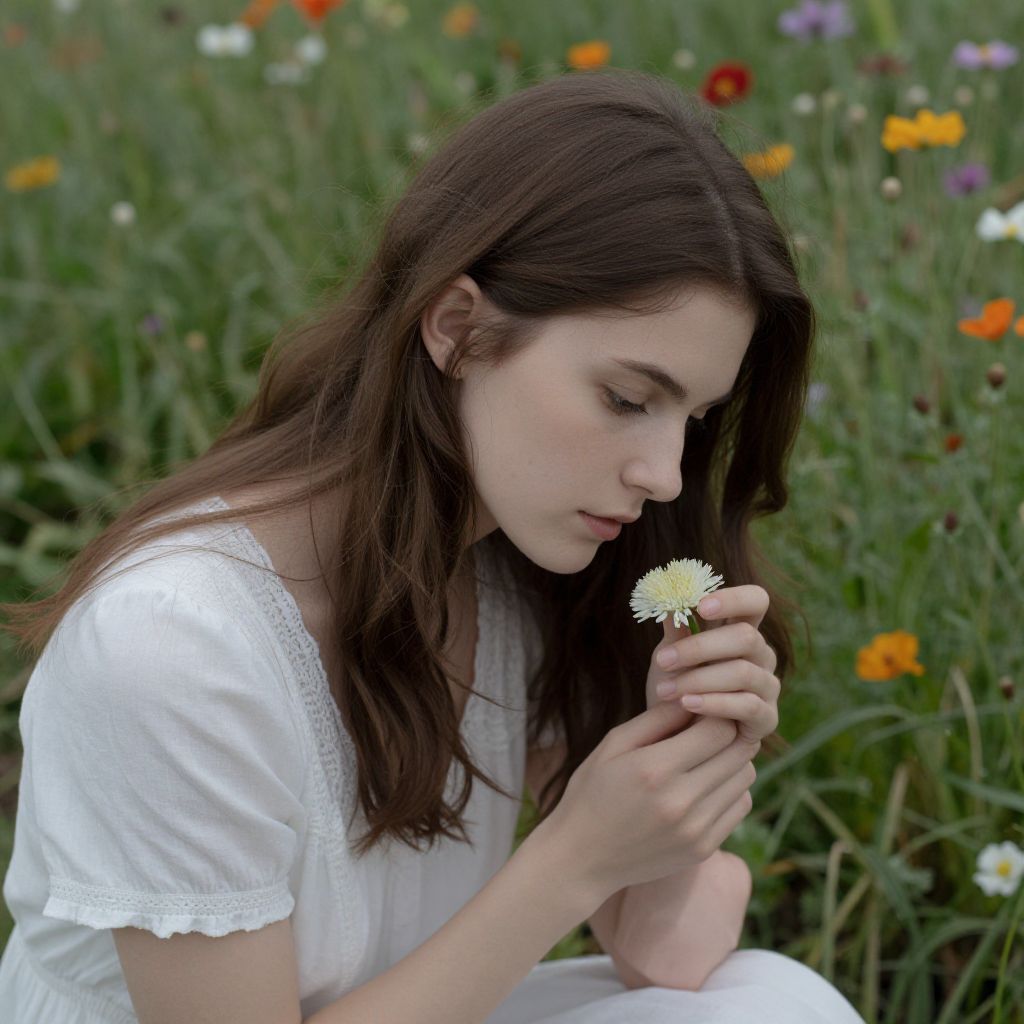 Photograph of a young Caucasian woman with long, dark brown hair and fair skin, wearing a white, short-sleeved, lace-trimmed blouse. She is crouching in a lush, green meadow filled with colorful wildflowers, including orange and purple blooms. She is gently holding a small white daisy close to her face, looking at it with a serene, contemplative expression. The background is softly blurred, emphasizing her peaceful presence in the natural setting. The lighting is natural, highlighting her delicate features and the textures of her clothing and the flowers.