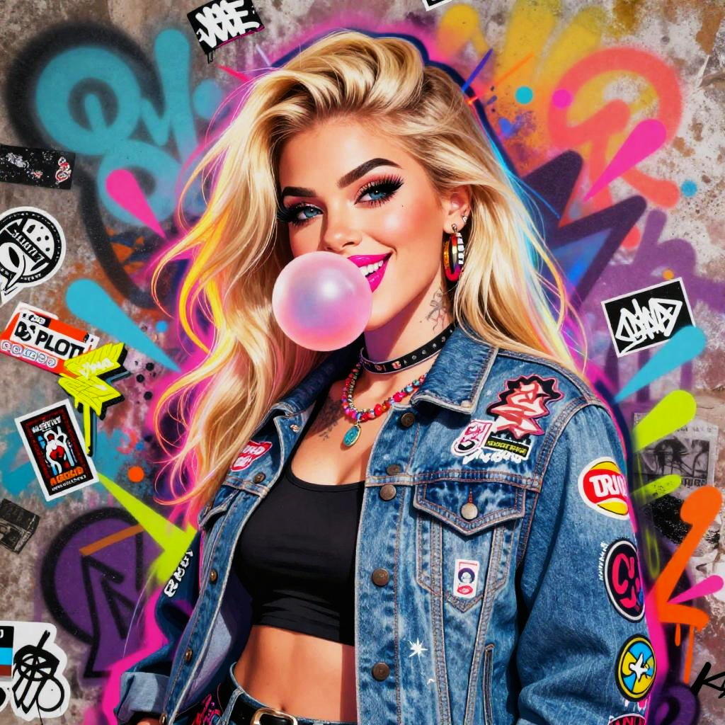 Realistic photo.A vibrant, graffiti-style custom art piece of a female character with bubblegum-blonde hair, styled in an eye-catching, urban fashion. She has vibrant lipstick, a cheeky smile, and a denim jacket covered in patches with a confident, streetwise vibe. The artwork features dynamic lines, neon accents, and bold, colorful shading, capturing a lively, rebellious energy. Set against a graffiti-style background with colorful drips and layered stickers, blending urban art with a modern twist. realistic photo