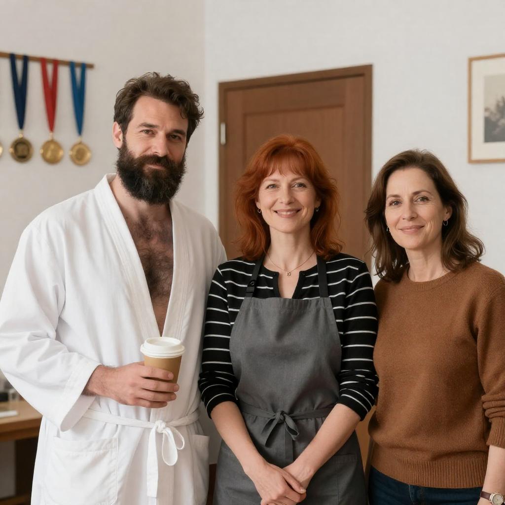 Photograph of three people standing indoors. A bearded man in a gray jacket faces left, a woman with short brown hair and a plaid shirt smiles at the camera, and a man with short brown hair in a black jacket stands to her right. A decorated Christmas tree is in the background.