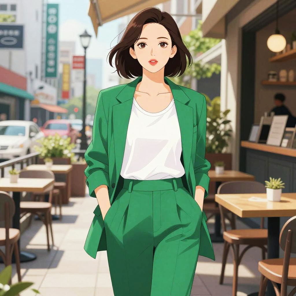 Digital anime-style drawing of a young woman with fair skin and short, dark brown hair. She wears a green blazer over a white V-neck top and matching green high-waisted trousers with hands in pockets. She stands confidently on a sunlit urban sidewalk with a blurred background of café tables, plants, and buildings. The café has a warm, inviting atmosphere with wooden furniture and potted plants. A soft sunlight filters through, highlighting her relaxed yet stylish appearance. The overall color palette is vibrant, with greens and whites contrasting against the warm, blurred background.