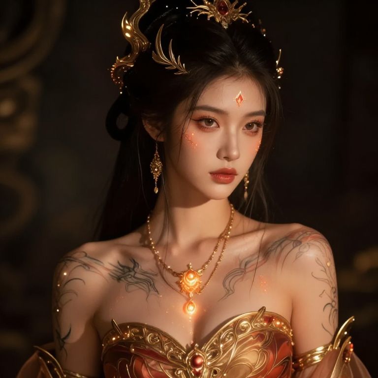 Photograph of an East Asian woman with long black hair, fair skin, and striking blue eyes. She wears a gold headpiece with ornate, flame-like designs and a central jewel, along with a matching gold necklace adorned with red and gold accents. Her strapless top is gold with decorative elements. The background is a plain, light gray. The image has a soft, slightly overexposed aesthetic, emphasizing the gold and her delicate features. Her expression is neutral, and the focus is on her upper body.