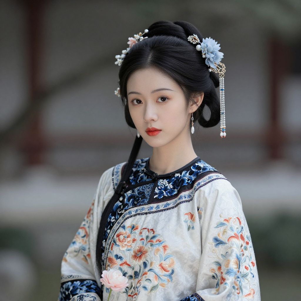 Female chinese costume, 1girl, solo, black hair, chinese clothes, hair ornament, blurry background, blurry, looking at viewer, flower, outdoors, realistic, standing, red lips, asian, hair flower