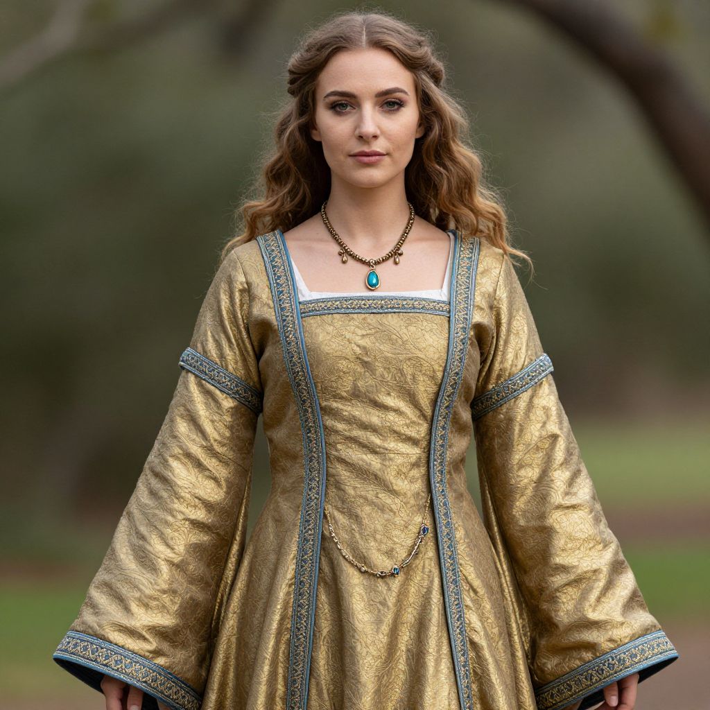 Costume australia, woman in medieval dress with gold and blue trimmings and a necklace