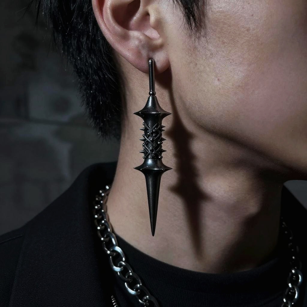 Goth industrial piercing close-up, intricate black metal bars and spikes, dark moody lighting, high contrast shadows, urban grunge background, edgy alternative fashion style
