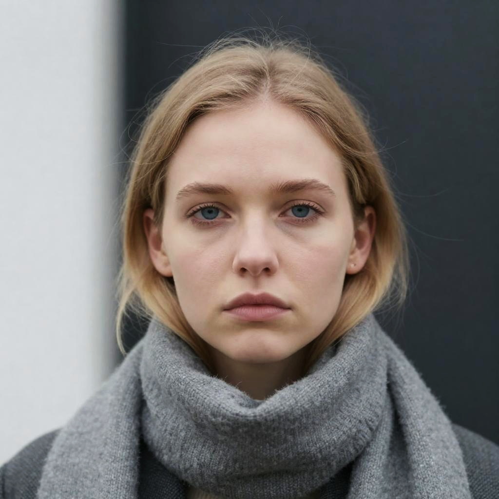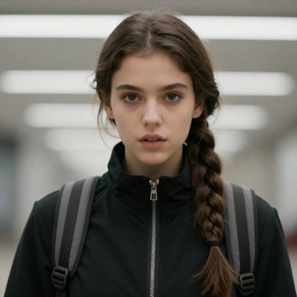 Young woman with blonde braided hair, blue hoodie, leaning against a pink wooden wall. She has a neutral expression, backpack on her back. Hood is up, windblown hair. Photograph. Background: weathered pink wooden surface.