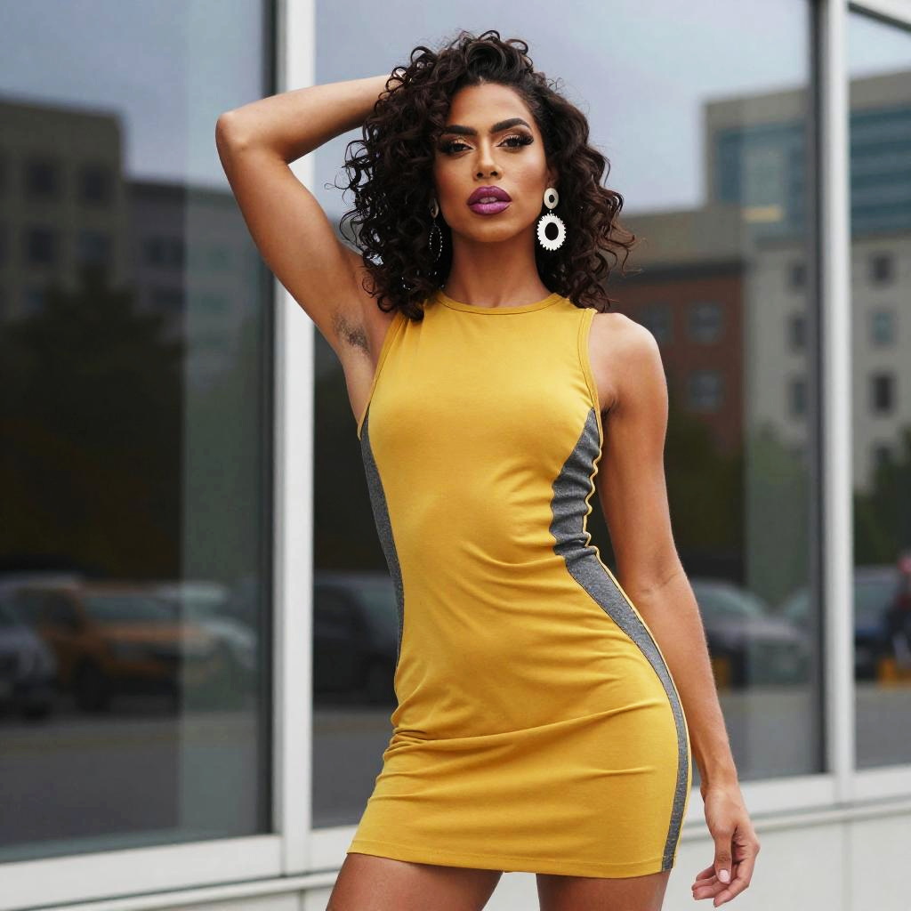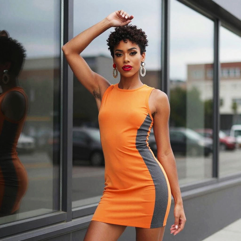 Transgender model, bold street-style fashion portrait, androgynous model with sleek straight blonde hair and winged eyeliner posing confidently with one arm raised, wearing a bodycon mini-dress in vibrant red with black lace accents with contrasting side panels, statement earrings, bright lipstick, polished makeup, blurred modern cityscape reflected in large windows behind, overcast daylight, contemporary urban fashion photography