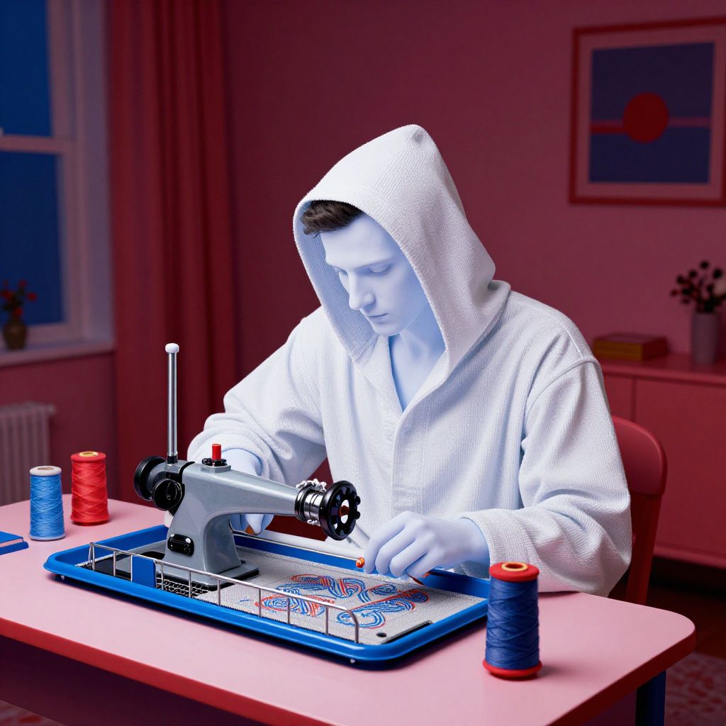 Photograph of a young man in a white bathrobe, sewing machine, blue and red spools, pink room, focused expression.