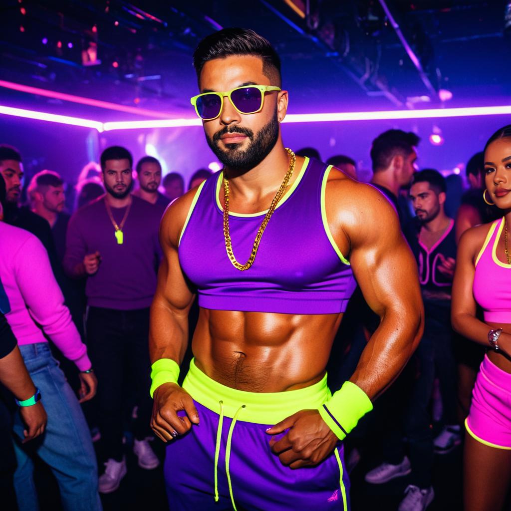 Neon glow party outfit, photorealistic, male model, muscular, wearing neon purple crop top and matching neon purple tracksuit with yellow drawstrings, sunglasses with pink lenses, gold chain necklace, short dark hair, beard, standing in a neon-lit nightclub, surrounded by blurry people in the background, vibrant purple and pink neon lights, party atmosphere, neon outlines on clothing, futuristic style, nighttime, club scene, digital art, vibrant colors, energetic, fashionable, confident pose