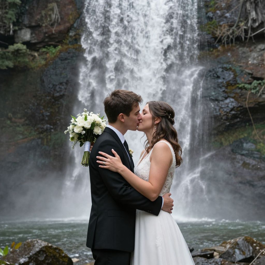 Photograph of a newlywed couple kissing passionately in front of a cascading waterfall. The man, with short brown hair, wears a dark suit and holds the woman, who has long dark hair and wears a white, sleeveless wedding dress with intricate beadwork. She is lifted off the ground, her left leg bent and her right leg extended. The background features a rocky waterfall with white water flowing down, surrounded by dark rocks and green moss. The couple is centered, with the waterfall behind them, creating a romantic and natural setting. The image has a vivid, colorful style.