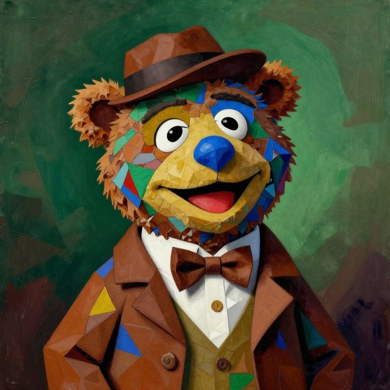 The image depicts Fozzie Bear from The Muppets, rendered in a style reminiscent of Pablo Picasso's Cubism. The bear's face is composed of geometric shapes and vibrant colors, creating a mosaic effect. His fur is depicted with a patchwork of various hues, including shades of brown, green, and blue, giving it a textured appearance. Fozzie's nose is a striking blue, contrasting with his brown fur. He is wearing a brown hat, a white shirt with a brown bow tie, and a brown jacket, all of which are detailed with colorful patterns. The background is a gradient of dark green and brown, with abstract brushstrokes that add depth and movement to the composition. The overall arrangement of the elements suggests a dynamic and lively scene, capturing the essence of Fozzie Bear's character in a unique and artistic manner.