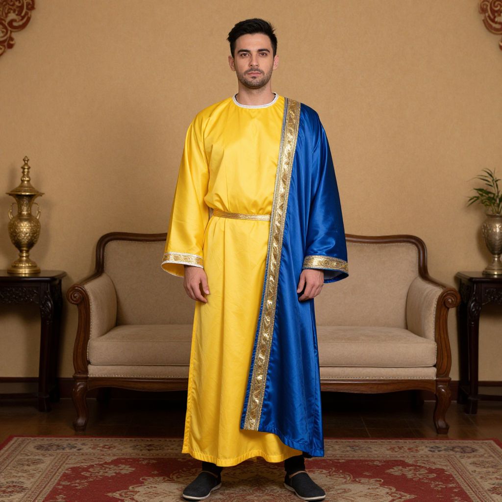 Euphoria Clothes Costume, man in a yellow robe and blue and gold robe standing in a room
