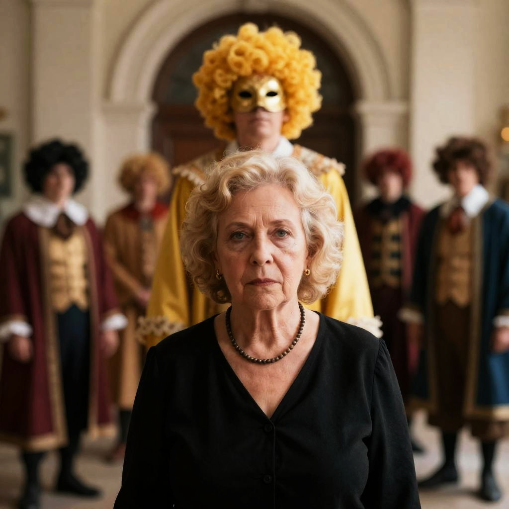 Old woman with curly blonde hair in black dress, serious expression, foreground. Background: four people in elaborate, colorful costumes, one with large yellow wig and mask, arched doorway, indoor setting.