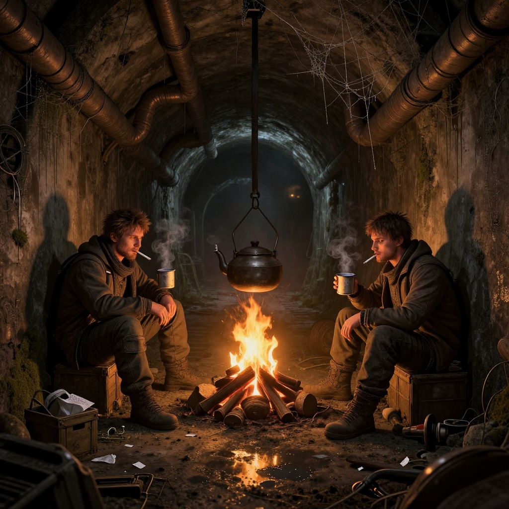 Photograph of two men sitting on wooden crates around a small campfire in a dimly lit, underground tunnel with rough, stone walls and exposed pipes. Both men wear dark, heavy jackets and boots, with one smoking a cigarette while the other holds a steaming metal mug. A black kettle hangs from the ceiling above the fire. The fire casts a warm, orange glow, contrasting with the dark, shadowy tunnel. Scattered papers and a small bag are on the ground near their feet. The background is dark and cavernous, with a faint, distant light visible.