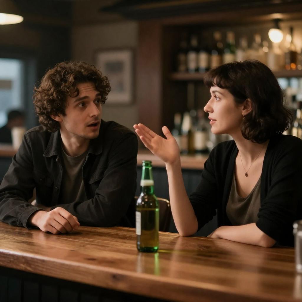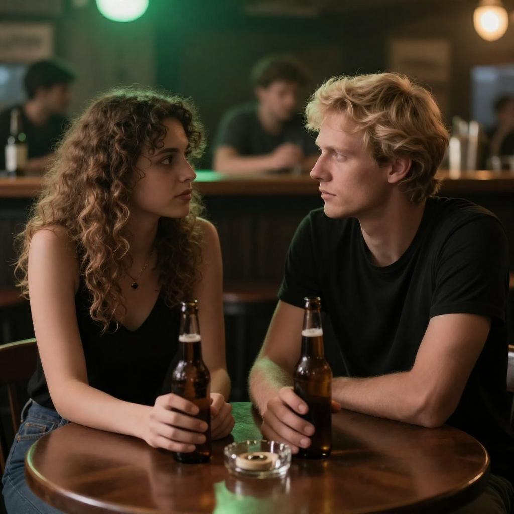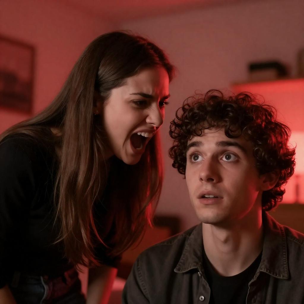 Photograph of two people in a dimly lit room with red lighting. Woman with long brown hair, intense expression, mouth open in a scream, leans close to a man with curly brown hair, wide-eyed, looking sideways. Background blurred with red light.