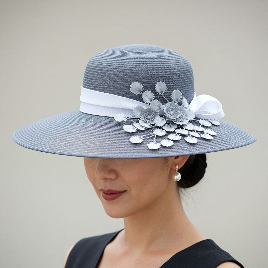 Elegant Chillingham Fascinator by Hostie Hats featuring a wide-brimmed gray hat adorned with a delicate light gray floral embellishment and a sleek white ribbon, worn by a woman with a poised expression and pearl earrings.