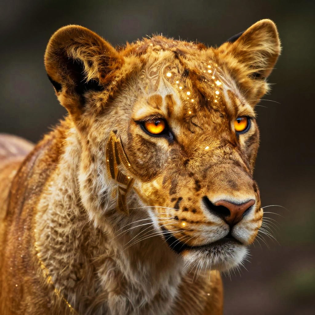 Close-up portrait of a goldingo with intricate tribal markings glowing faintly on its golden fur, intense amber eyes staring into the distance, background blurred to emphasize the majestic creature, detailed and realistic rendering
