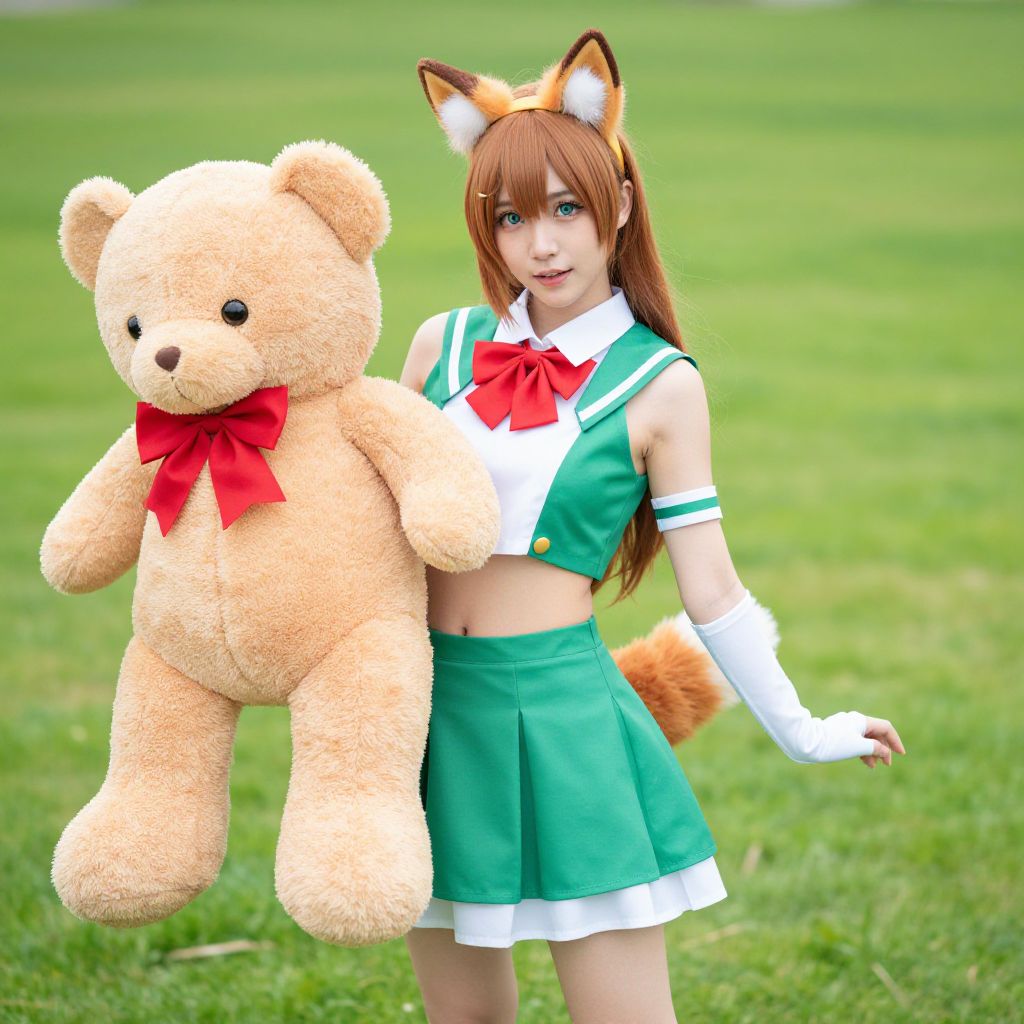 A young woman cosplays as Annie from League of Legends, wearing a green and white outfit with a red bow tie and fox ears headband. She stands outdoors on green grass, holding the tail of a large teddy bear dressed with a red bow, evoking a playful and charming anime-inspired style.