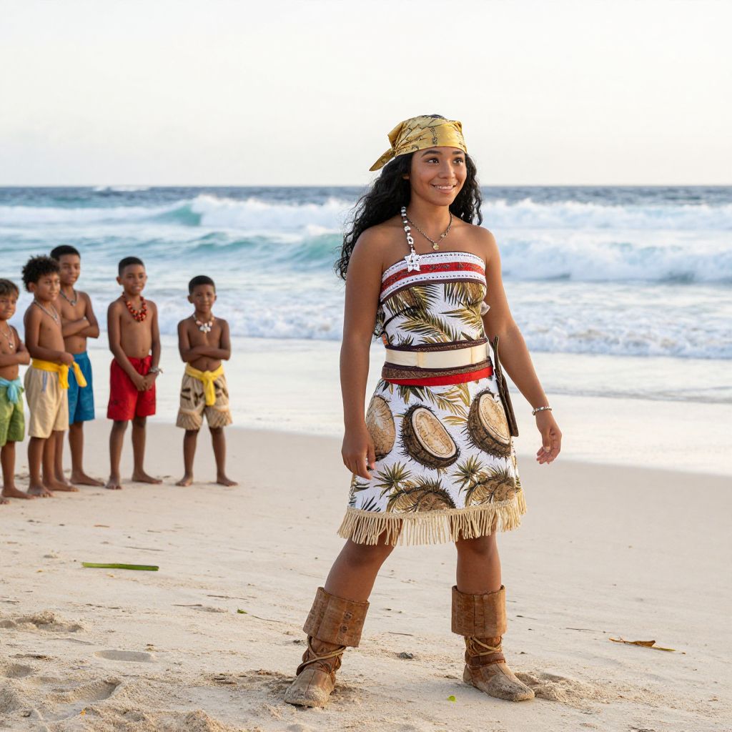 Realistic beachside scene showing Moana wearing a traditional Moana-inspired pirate costume featuring a coconut patterned cape, a golden pirate bandana, and wooden ankle boots, as she stands on a white sandy beach during a golden hour, waves crashing in the background, with a friendly group of local children watching her from a distance, her face showing a joyful, adventurous expression.