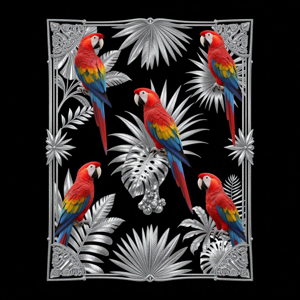 Photorealistic print of silver exotic, elegant tropical prints, isolated in a black background : : red parrots, art nouveau, trending on creativemarket