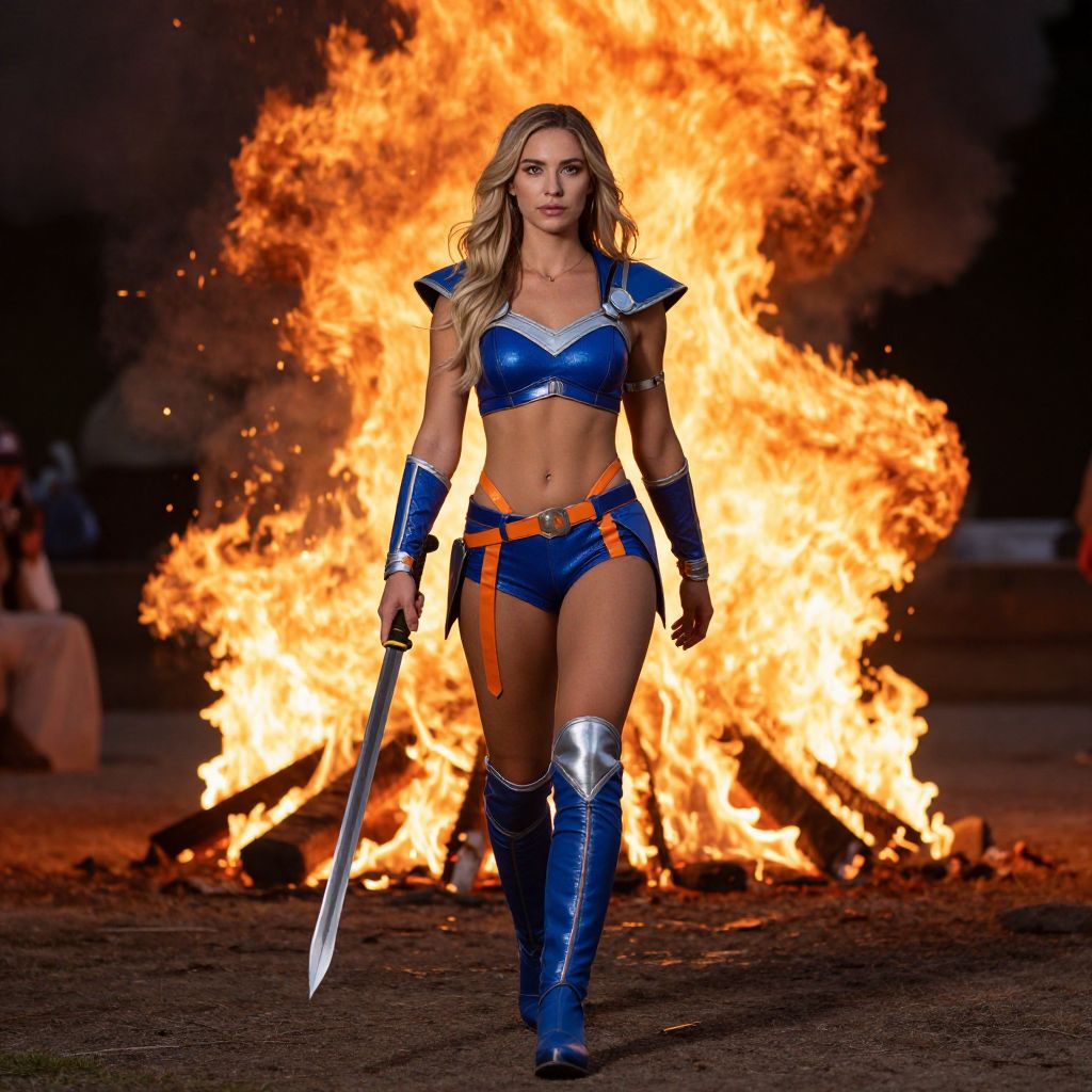 Blades Glory Fire And Ice, woman in a blue and orange costume walking in front of a fire