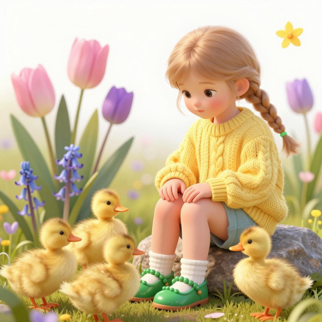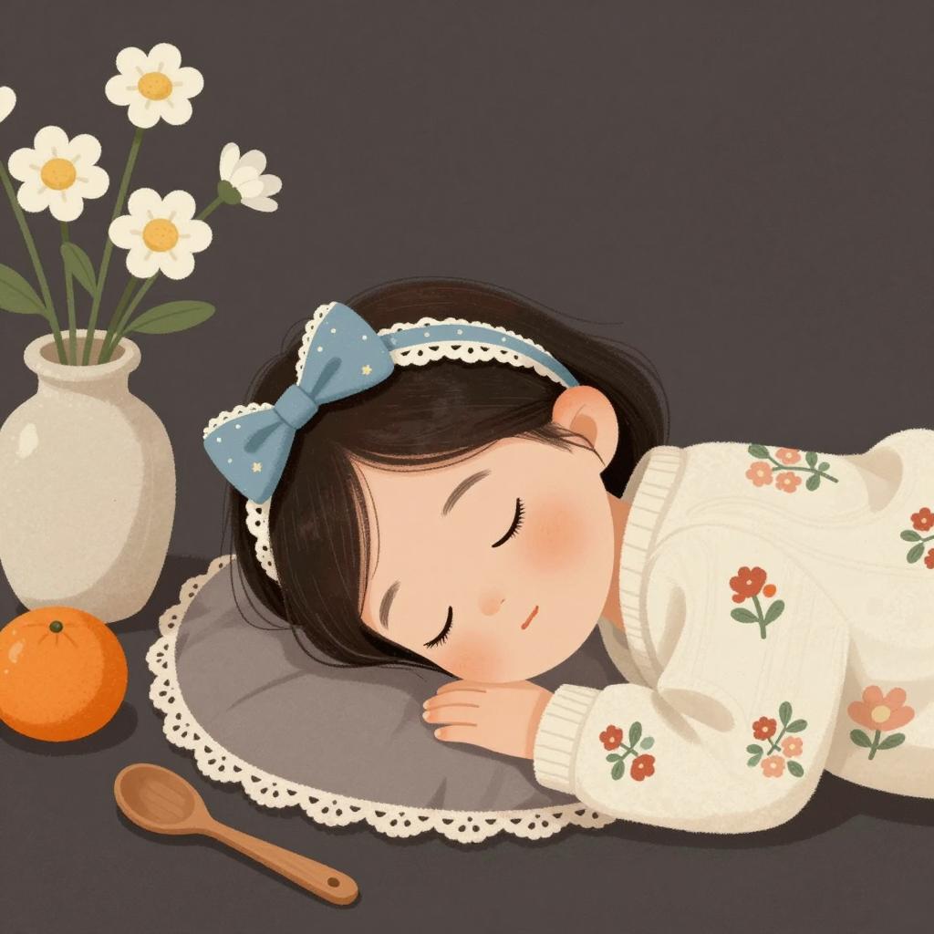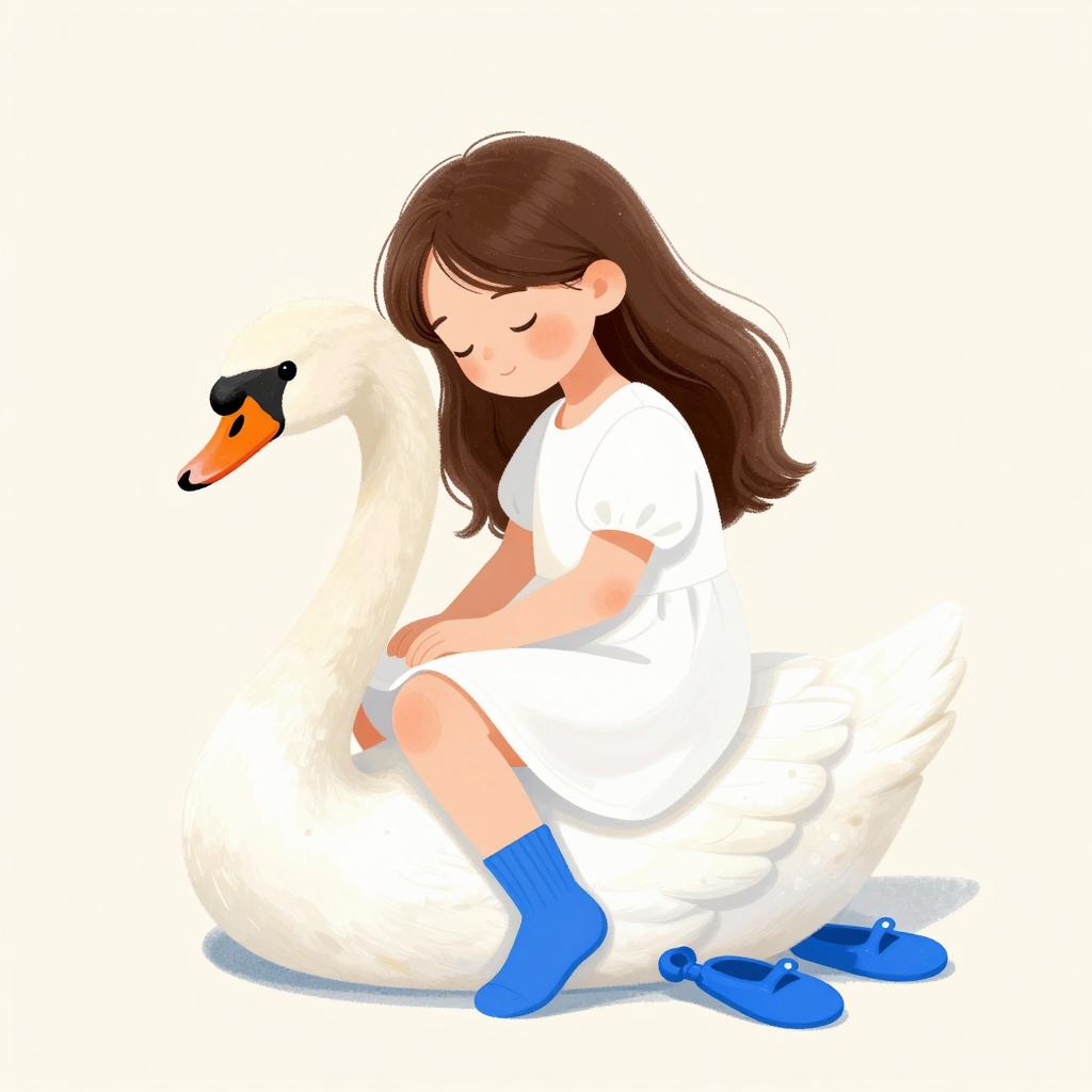 Illustration of a young girl with long brown hair, wearing a white dress and blue socks, sitting on a white swan with blue body. Swan has orange beak and white tail. Girl's head tilted down, eyes closed. Blue shoes near swan's legs. Cream-colored background. Girl's arms rest on swan's back. Swans tail feathers extend to the right.