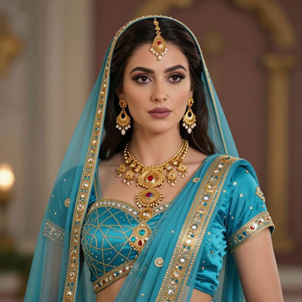 Raya Costume Blue, a woman in a blue dress and gold jewelry