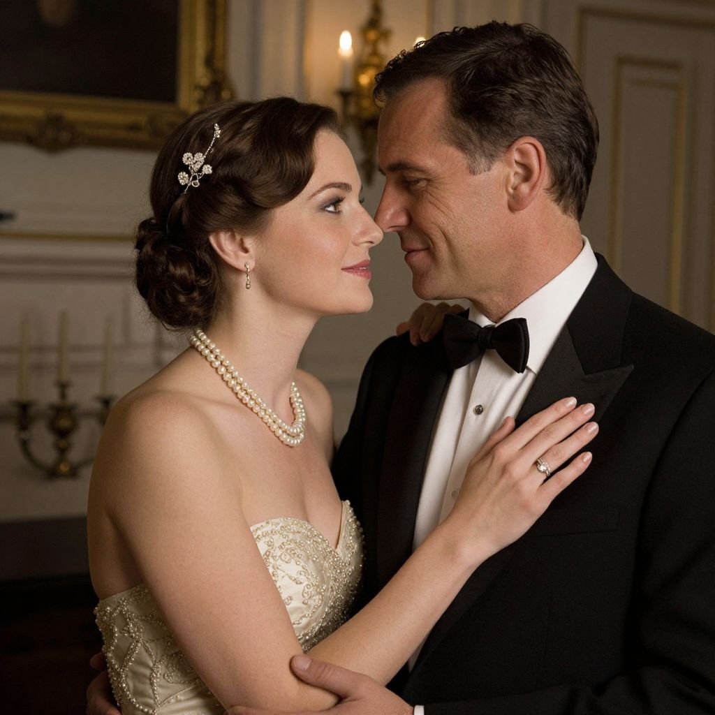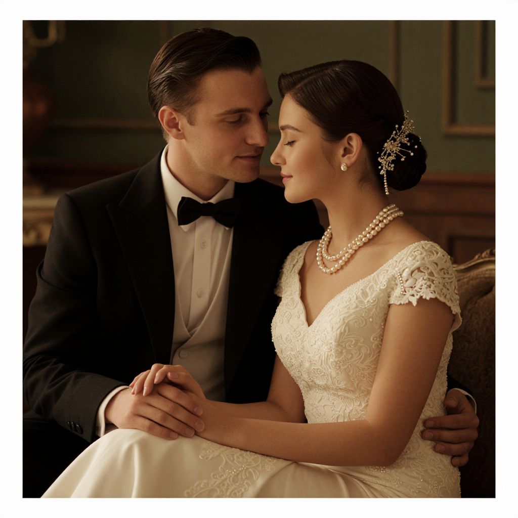 Elegantly dressed couple sharing an intimate moment in a dimly lit room, with the woman adorned in a pearl necklace and hair accessory, while the man wears a classic tuxedo.