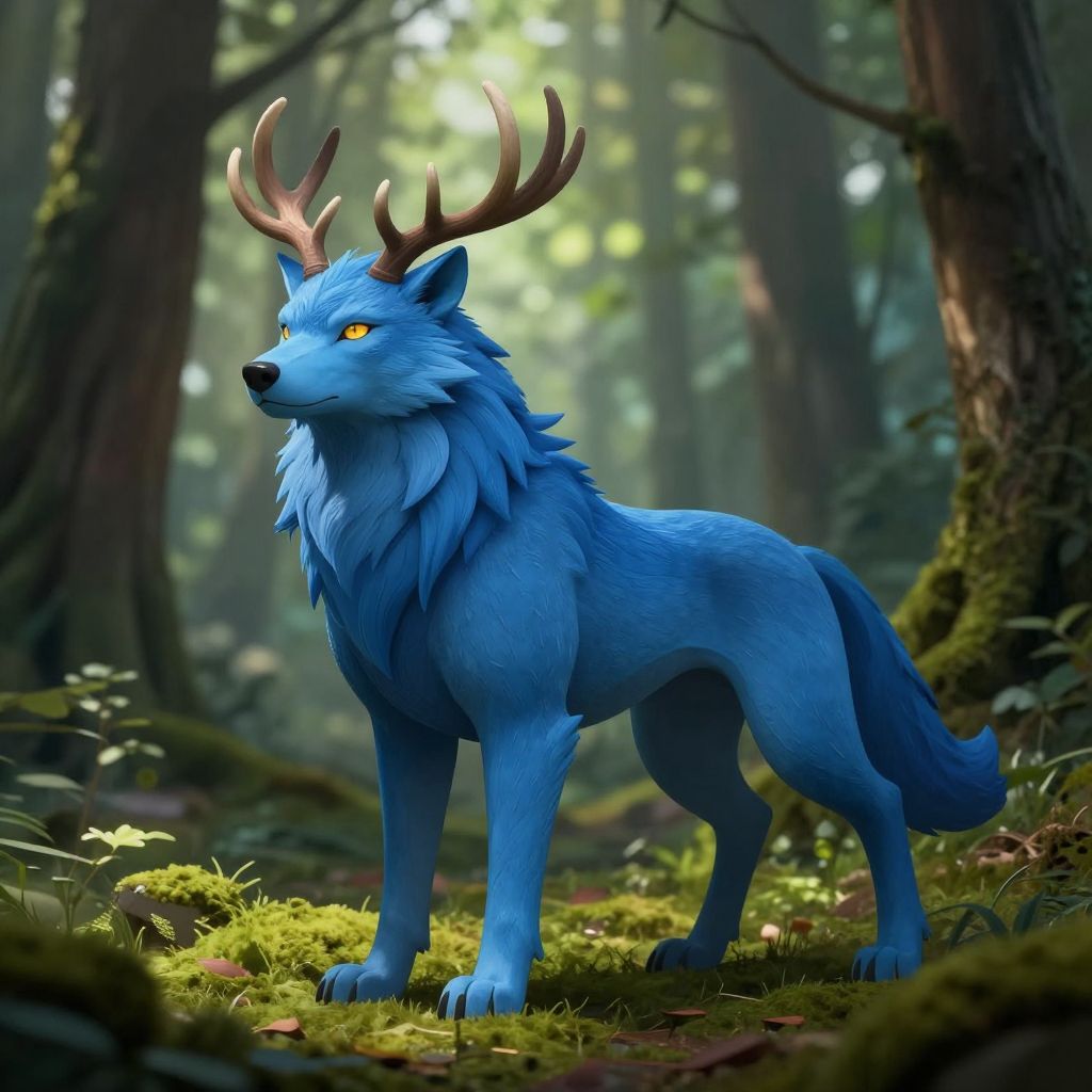 A detailed digital illustration of a blue mythical wolf-like creature with antlers, poised on moss-covered ground in a dense forest with tall trees and soft sunlight filtering through. The creature has a sculpted, armor-like fur texture and glowing amber eyes, blending fantasy and nature elements.