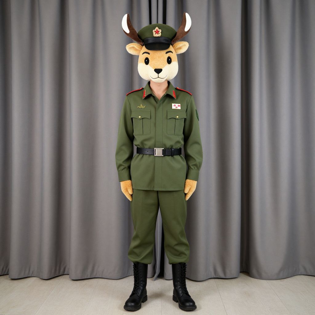 Photograph of a cartoon deer wearing a green military uniform with red accents, black boots, and a cap, standing against gray curtains.