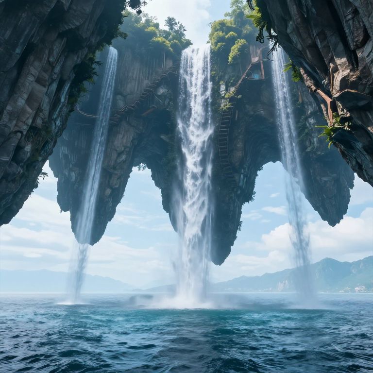 Towering, upside-down mountains float above an ocean of glass, where waterfalls ascend like stairways into the air.