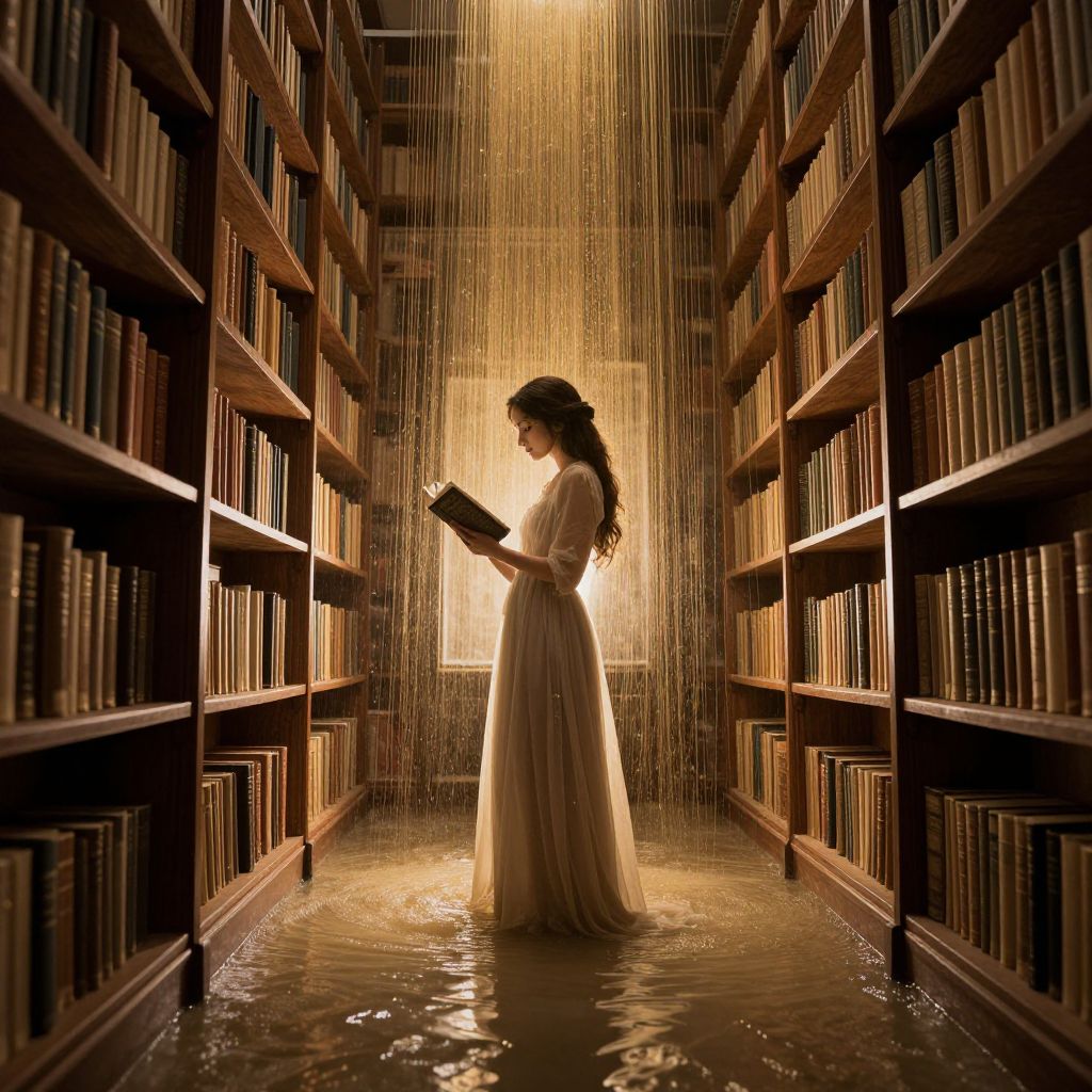 Photograph-like digital art depicting a silhouette of a woman with long, wavy hair in a flowing, white dress standing in a narrow, waterlogged library aisle. She is holding an open book, reading intently. The library has tall, dark wooden bookshelves filled with books on both sides, creating a tunnel effect. Warm, golden light from the ceiling illuminates the scene, creating a dramatic contrast with the dark shelves. Water droplets cascade from the ceiling, pooling around her feet, adding a mystical, ethereal atmosphere. The background shows blurred book spines, enhancing the depth and focus on the central figure.