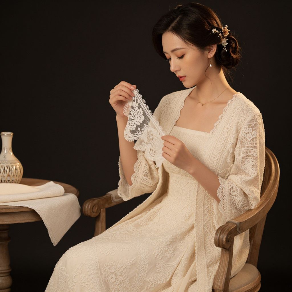 Photograph of an Asian woman with fair skin and dark hair, styled in an updo with small floral hairpins. She sits on a wooden chair against a black background, wearing an elegant, cream-colored lace dress with long sleeves. She holds a delicate, white lace garment in her hands, examining it closely. To her left, a small wooden table holds a beige cloth and a decorative ceramic vase. The lighting is soft, highlighting the intricate lace patterns of her dress and the lace garment she is holding. The overall mood is serene and reflective.