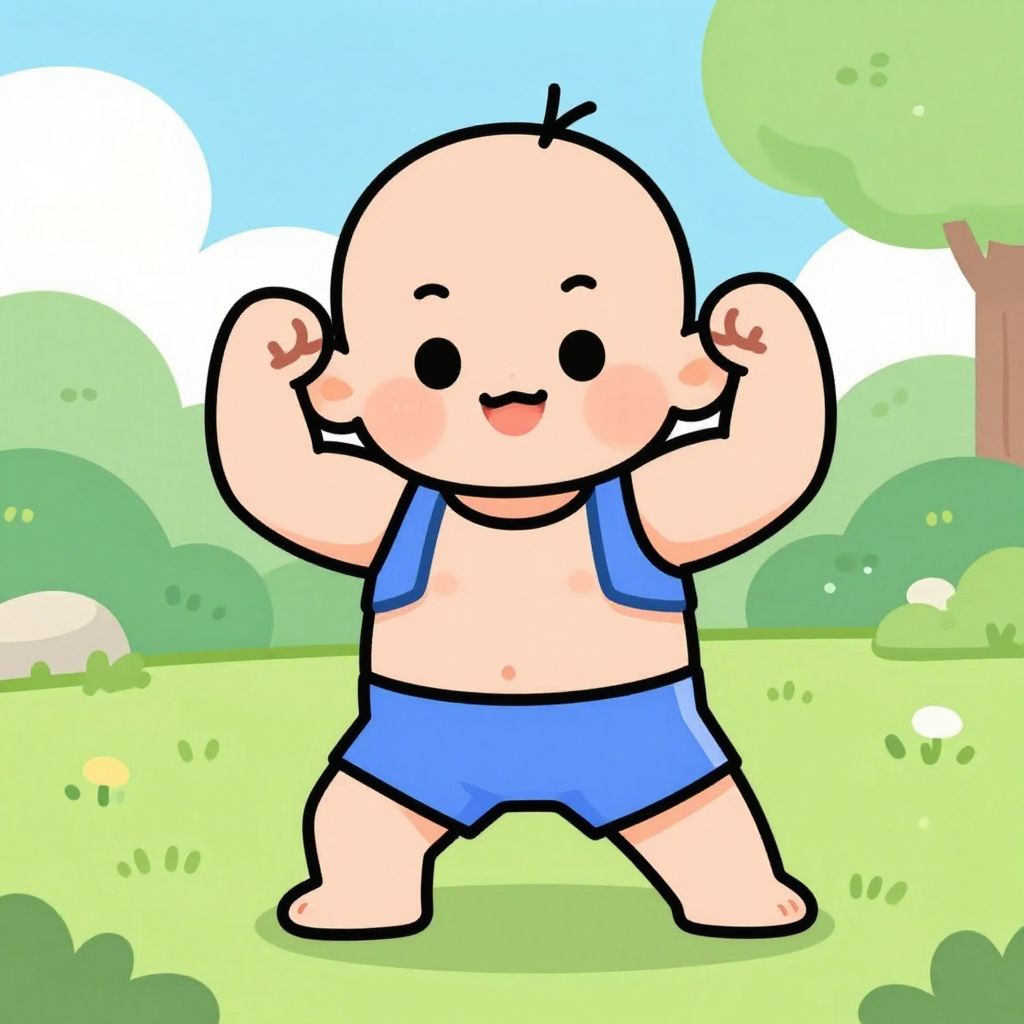 Baby with a six pack, wearing tiny workout gear, flexing muscles in a sunny park, cartoon style with bold outlines and cheerful atmosphere, dynamic pose, colorful background