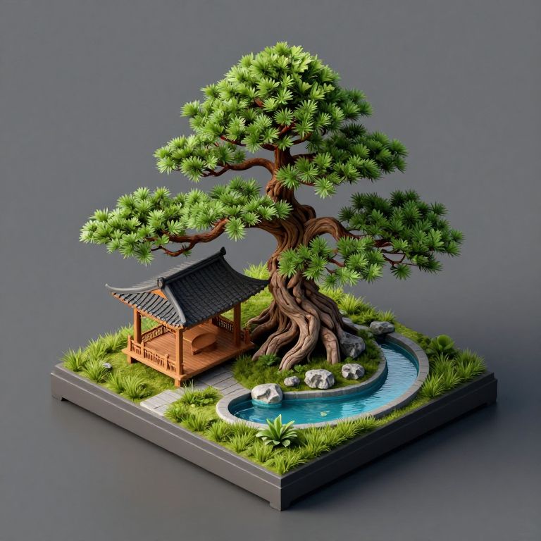 Isometric 3D Bonsai Tree Scene