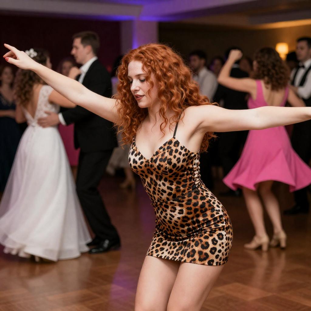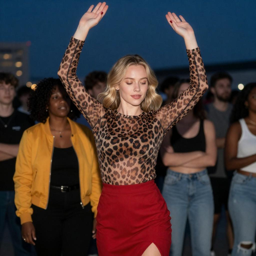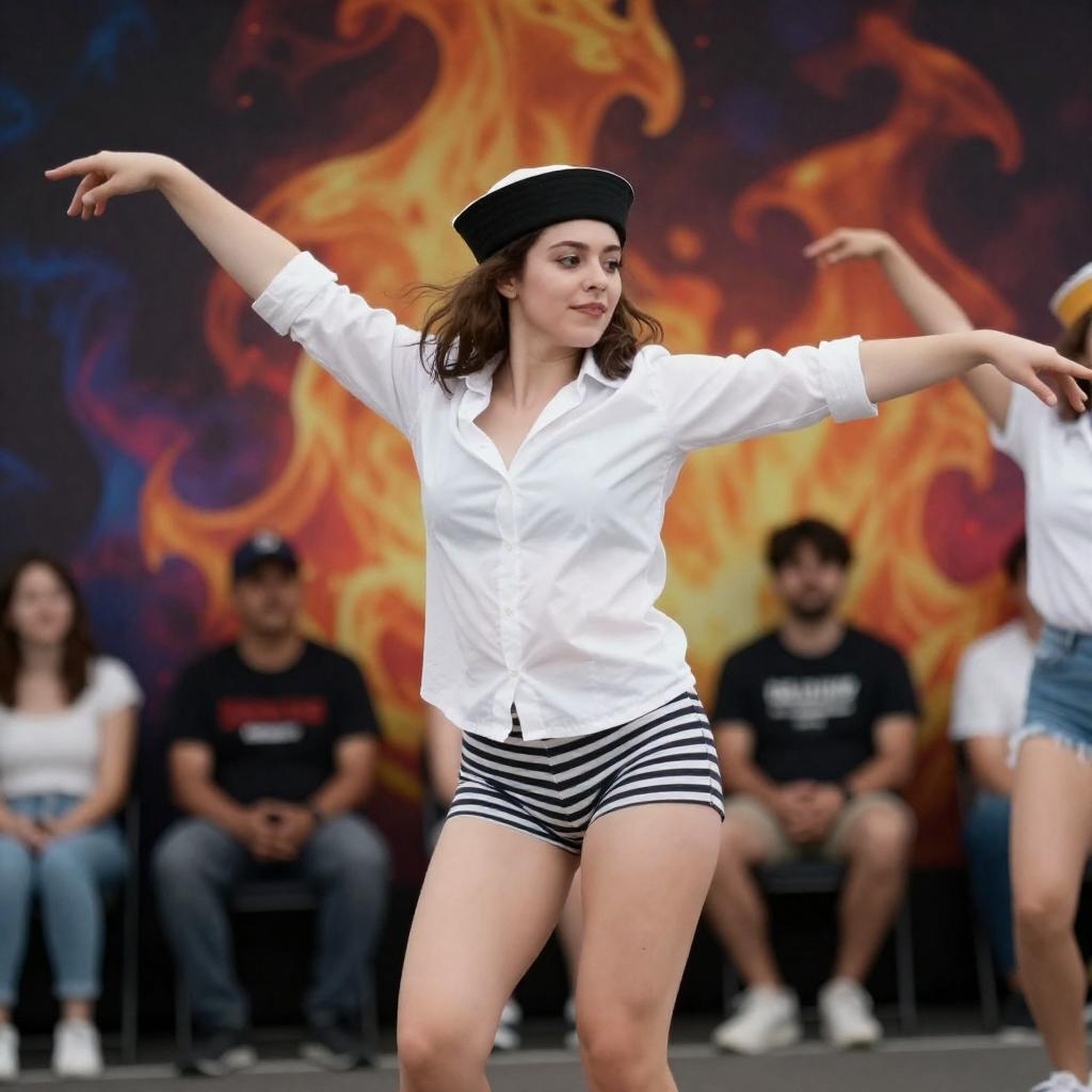 Photograph of a lively performance. A woman with shoulder-length brown hair, wearing a black sailor hat, white unbuttoned shirt, and black-and-white striped shorts, dances energetically with arms outstretched. She is surrounded by a colorful, fiery background and several seated audience members. The scene is vibrant and dynamic.