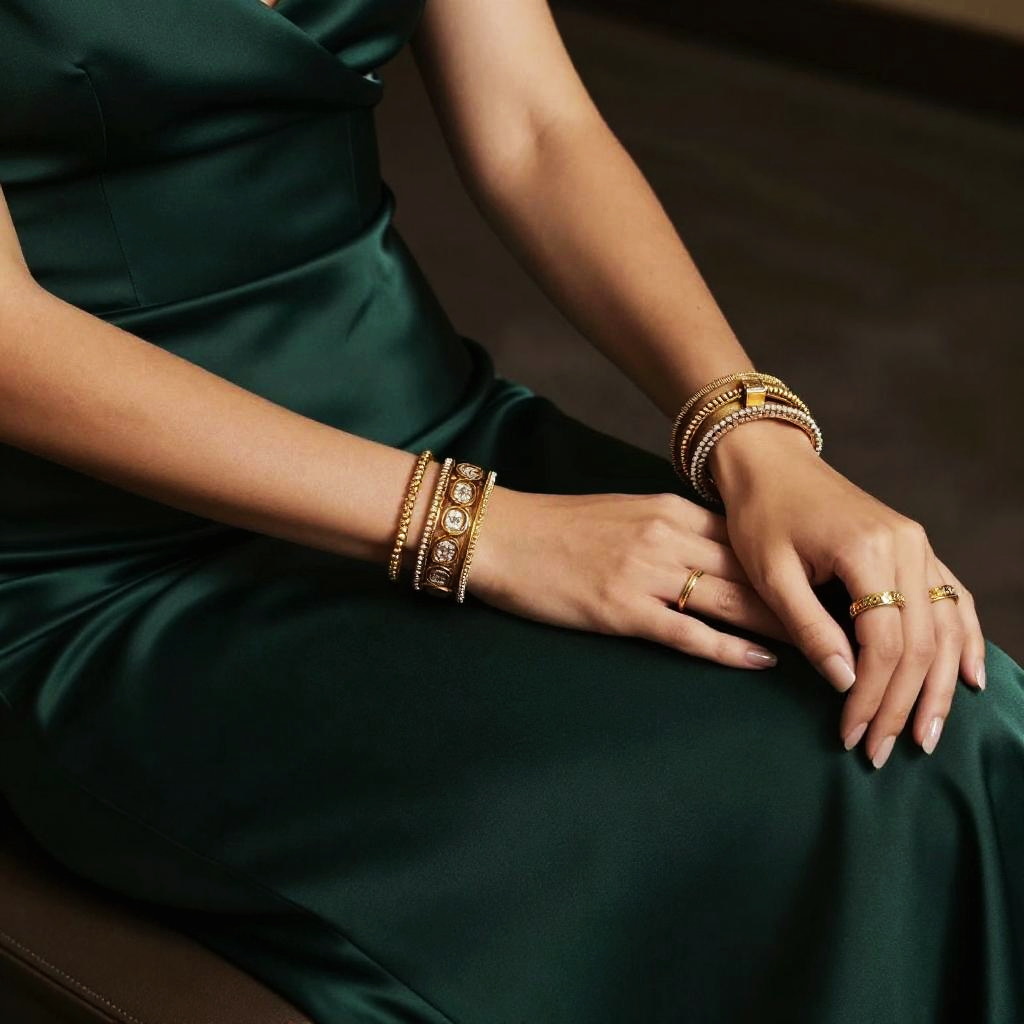 Jewelry with green dress, close-up of intricate gold bracelets and rings complementing a luxurious deep green satin evening dress, moody background, cinematic vibe