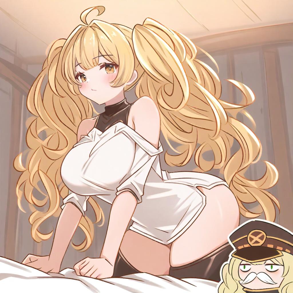 Monika weisswind, granblue fantasy, 1girl, brown eyes, green eyes, blonde hair, long hair, wavy hair, twintails, ahoge, large breasts, thighs, peaked cap, bare shoulders, by artist guin guin, animagine