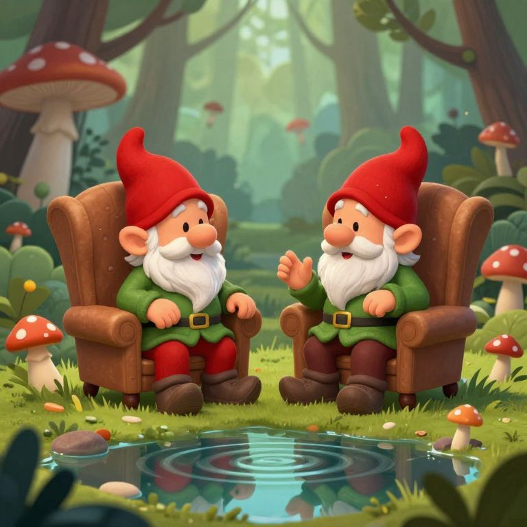 Two cartoon gnomes with red hats and green clothes, sitting in brown armchairs by a pond in a whimsical forest, surrounded by mushrooms