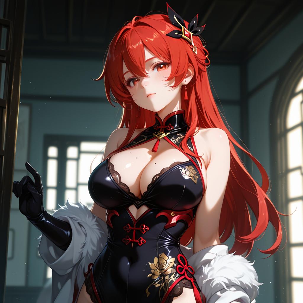 Murata himeko (vermillion knight), honkai (series), 1girl, yellow eyes, red hair, long hair, hair ornament, large breasts, mole on breast, cleavage, china dress, armored leotard, black gloves, bare shoulders, by artist jcm2, dark_illustrious